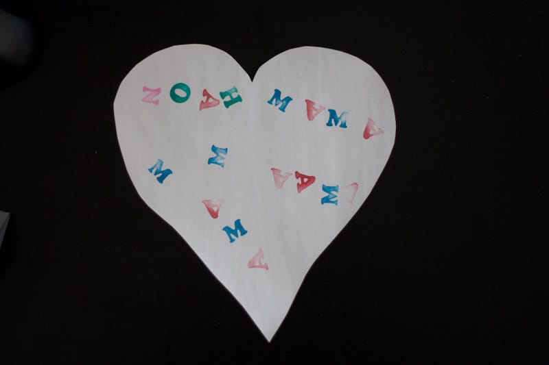 Laat jouw kind “mama” stempelen op het hartje. Laat ruimte bovenin de hoek. Laat je kind daar zijn naam stempelen.