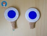 - Knip twee ogen op steeltjes uit karton. Plak of verf de oogkas en de iris van de kikker.