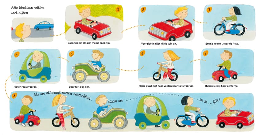 Ter afwisseling zie je 8 plaatjes waarop je kinderen ziet rijden met hun speelgoedvoertuigen. Als ze allemaal tegelijk vertrekken, staan ze in de file.