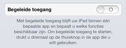 Apple heeft daar nu een oplossing voor gevonden: “begeleide toegang”. In iOS 6 is het nu mogelijk om de toegang tot sommige opties/onderdelen te beperken. Zo kan de homeknop op de iPad worden uitgeschakeld. Heel erg handig! Nu kan je kind niet meer per ongeluk op de knop drukken en uit de app gaan, of van app wisselen als dat niet de bedoeling is. Ideaal in een klassituatie waarin een kind een app krijgt om te leren en hij niet even snel naar een ander spelletje kan schakelen zonder dat de juf het ziet. Het roteren kan vergrendeld worden binnen een app, zonder dat de zijknop die voor geluid bedoeld is op rotatie vergrendeling gezet hoeft te worden. Daardoor is het probleem, dat mensen ineens apps zonder geluid hebben, opgelost.