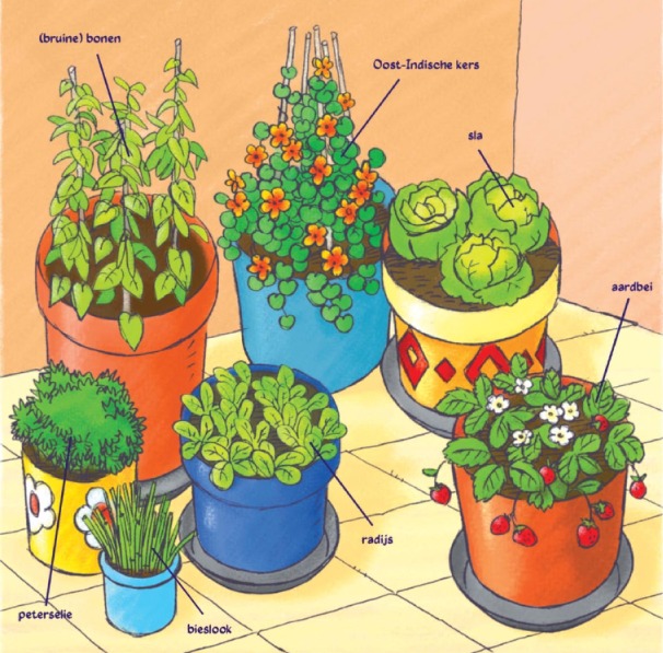 Wat fijn dat er ook een terrastuin in het boek wordt uitgewerkt. Woon je in een flat en heb je dus geen tuin, dan legt het boek je uit hoe je toch een eigen moestuintje in potten kan planten.