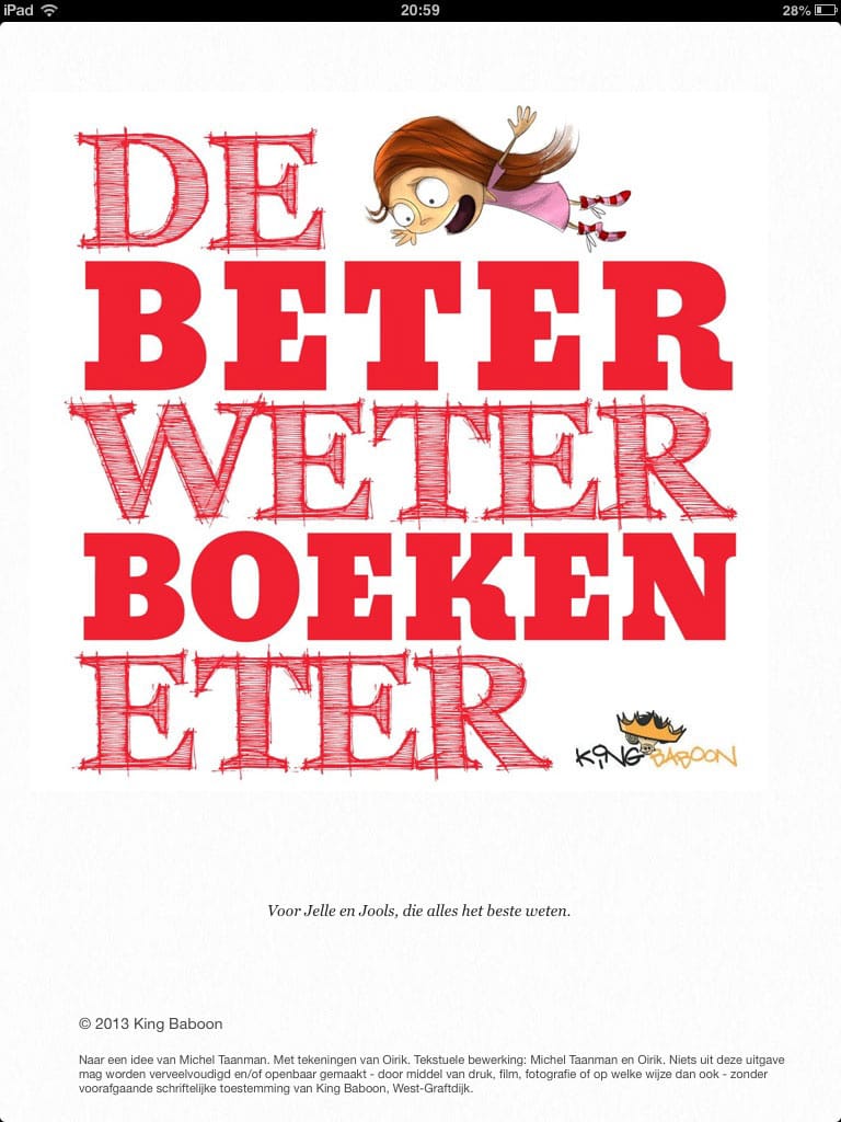 Wauw wat een prachtig iBook! Het boek bevat prachtige plaatjes. Het verhaal dat verteld wordt in het boek spreekt erg aan bij de kleuters in mijn klas. Ze zaten op het puntje van hun stoel, want wat ging Jools nu weer voor avontuur beleven samen met de Beterweterboekeneter! Een mooi bijkomend voordeel vind ik dat de app gratis is! Er zijn maar weinig gratis kinderboeken iBooks super dus!
