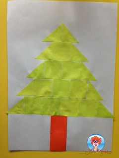 - Plak de vierkanten en driehoeken op en maak zo een kerstboom.