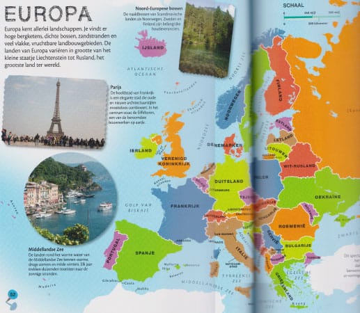 - Bij de landkaarten zie je veel plaatjes met tekst. Zo leer je meer over de landen.