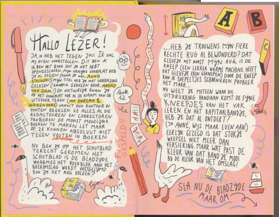 Ik vind het leuk dat “het boek” je meeneemt bij het lezen. Het boek groet je aan het begin op het schutblad, legt je uit waarom je vaak lege bladzijden ziet in een boek voordat je bij het begin van een verhaal komt en legt je uit hoe we deze bladzijden noemen en wat hun functies zijn.