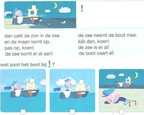 Je komt ook strips en andere teksten tegen die gepaard gaan met illustraties. De tekst en opdracht van hiernaast vind ik geweldig! In deze strip moeten de kinderen goed nadenken over wat ze lezen om te begrijpen welke illustratie bij ! hoort te staan.
